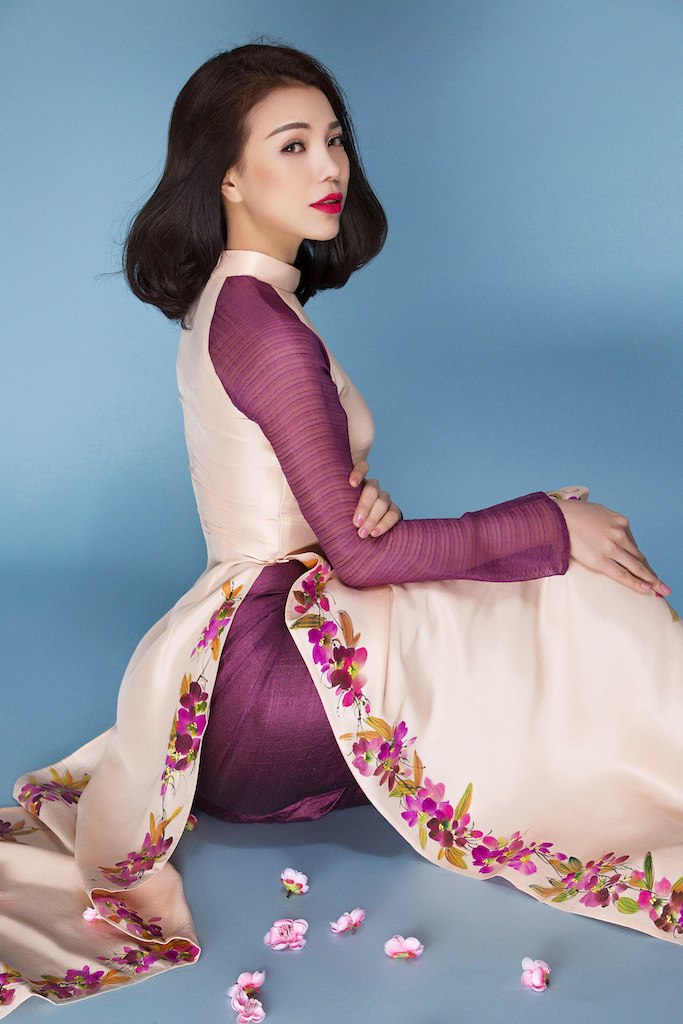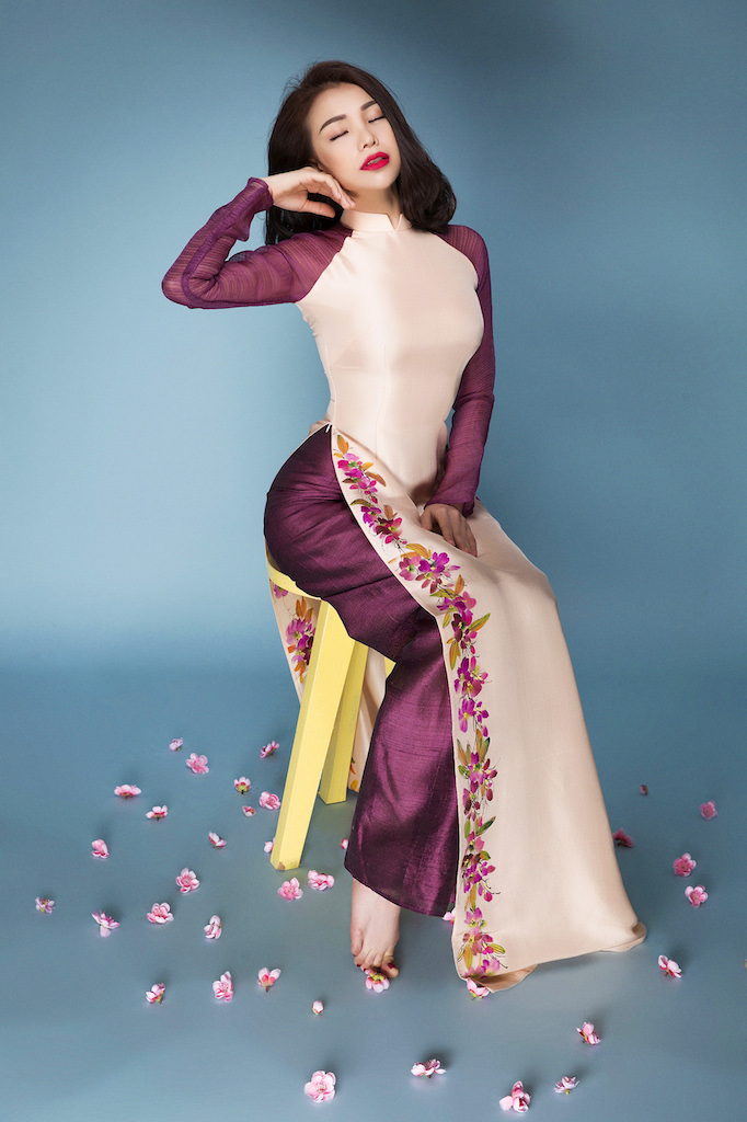 | Trà Ngọc Hằng cũng thực hiện bộ hình áo dài xuân rực rỡ của nhà thiết kế Liên Hương thiết kê riêng cho cô, với những màu sắc cực kỳ tươi vui, rạng rỡ. Sắc hoa đào, hoa mai trên các thiết kế bằng lụa, gấm giúp Trà Ngọc Hằng dịu dàng, đầy xuân sắc ngời ngời một mùa Xuân mới. |