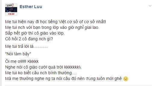 Bên cạnh đó, Hari Won cũng chia sẻ mẹ của cô đang đi học tiếng Việt: "Mẹ tôi hiện nay đi học tiếng Việt. Mẹ tôi nói chuyện với bạn trong lớp vào giờ nghỉ giải lao. Sắp hết giờ thì cô giáo vào lớp. Cô hỏi 2 cô đang nói chuyện gì? Mẹ tui trả lời là "Nói tàm bậy". Ôi mẹ ơi! Nghe nói cô giáo cười quá trời. Mẹ tôi không biết câu nói chuyện bình thường... Mà mẹ thường nghe người ta nói câu đó nên dùng luôn mới ghê".