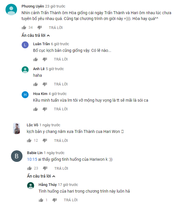 Phía dưới chương trình, rất nhiều khán giả bình luận rằng, cảnh Trấn Thành ôm Hòa Minzy giống hệt với cảnh anh ôm Hari Won hồi tại chính chương trình này. Kịch bản và cách ôm y chang nhau.