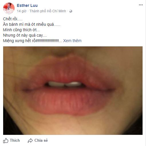 | Ảnh đôi môi sưng tều được Hari Won đăng trên Facebook |