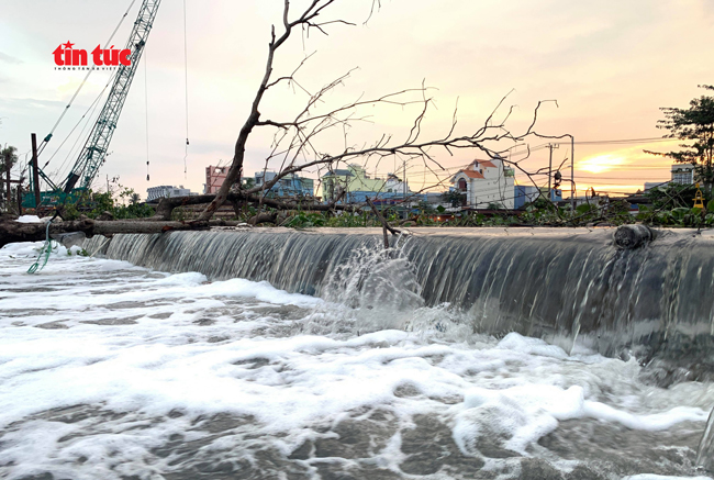 Cũng theo ghi nhận của PV Vietnamnet, tại quận Bình Tân vào lúc 16h30 chiều nay, thời điểm triều cường bắt đầu dâng cao, nước từ dưới cống trào lên đường với màu đen kịt nặng mùi.