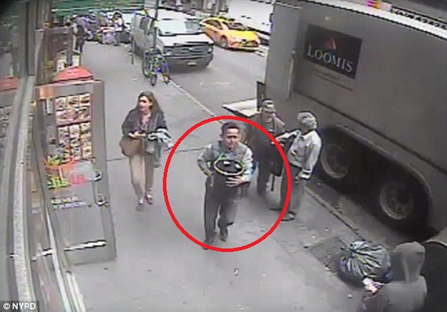 Trong clip điều tra mà cơ quan chức năng cung bố, người đàn ông đã lấy trộm thùng đựng vàng lá, trị giá khoảng 1,6 triệu USD (khoảng 35 tỉ đồng) từ một xe tải bọc thép đỗ ở quận Manhattan.