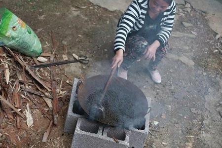 Một người dân trong làng đang rang khô phân dê trước khi nghiền nhỏ và pha với nước uống