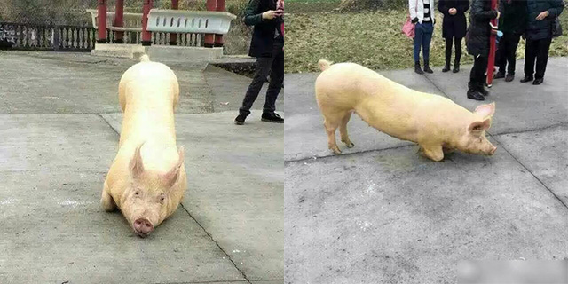 Chú lợn này đã quỳ trên mặt đất trong một thời gian dài, cho đến khi có một nhà sư trong đền bước đến và tụng kinh cho nó.
