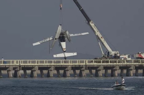 Sự cố xảy ra chỉ 10 phút sau khi chiếc thủy phi cơ cất cánh từ bãi biển trưa 20/7. Hình ảnh đăng tải trên mạng xã hội cho thấy phần mũi máy bay nằm trên cầu còn phần đuôi dưới nước.
