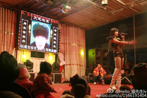 “Hai vũ nữ thoát y ăn mặc hở hang nhảy trên một sân khấu ở đám tang trong làng vào tối 15.2”, một nhân chứng họ Zhang cho hay.