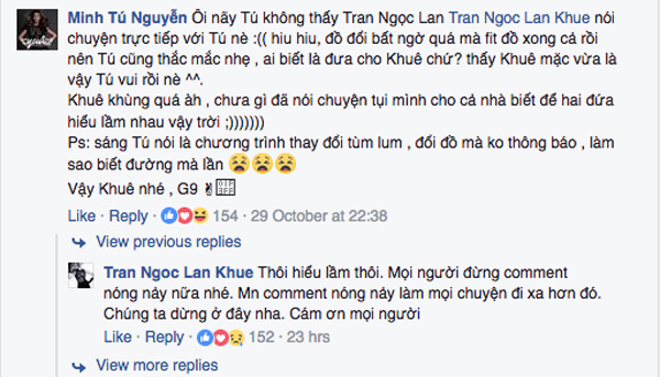 Sau đó, mọi chuyện dường như được giải quyết êm xuôi khi chính Minh Tú chia sẻ dưới dòng bình luận mình không biết chương trình bất ngờ thay đổi và vui khi Lan Khuê mặc vừa đồ. Cả hai cùng vui vẻ lên tiếng đây chỉ là chuyện hiểu lầm, mong mọi người đừng nóng nảy.
