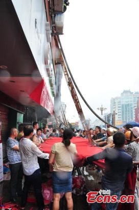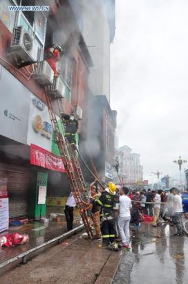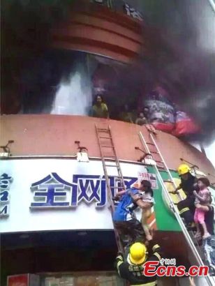 Lính cứu hỏa trèo lên tòa nhà để giải cứu người bị nạn. Hơn 100 người, hầu hết là trẻ em đã phải nhập viện sau khi tòa nhà thương mại tại Ninh Đức, Phúc Kiến bốc cháy hôm 16/9. Ảnh: China News Service/Ou Yufan |