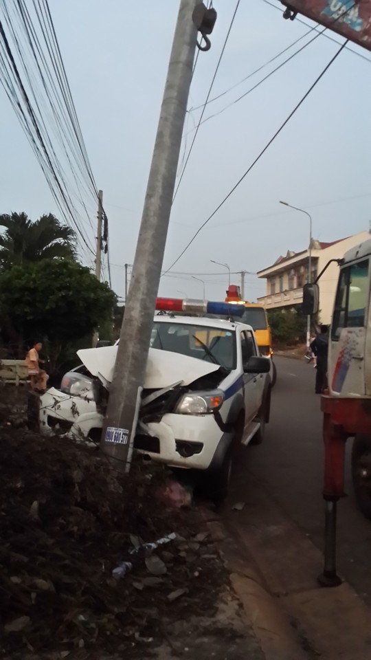 Đầu xe CSGT vỡ nát, cột điện gãy - Ảnh: Người lao động |