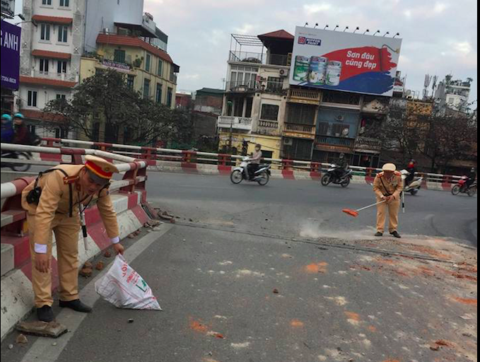 Vào khoảng 6h sáng nay 21/12, khi có mặt tại chốt phía Nam cầu Chương Dương, TP Hà Nội, Trung uý Đỗ Văn Đại và Nguyễn Văn Tuấn tiếp nhận ca trực đã phát hiện các loại phế thải như đất, gạch... vụn vỡ rơi rớt đầy trên khúc cua ở vòng xuyến đường dẫn lên cầu.
