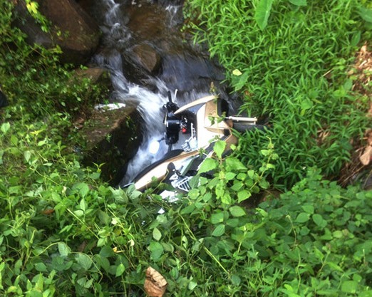 Chiếc xe máy bị xe khách lấn làn rơi xuống vực. Ảnh: Dân Trí |