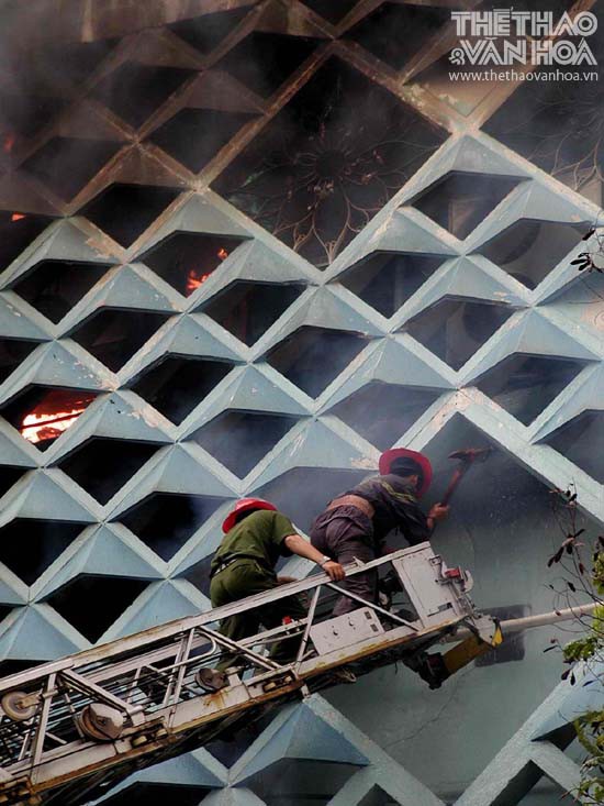 “Mặc dù đã phun nhiều nước nhưng do diện tích quá lớn nên hầu như ban đầu việc chữa cháy không hiệu quả. Tòa nhà ITC làm theo dạng các u, giữa các tầng lầu của tòa nhà từ tầng 2 đến tầng 7 lại rỗng ở giữa, đây là điểm làm đám cháy lan nhanh. Do vậy, việc chữa cháy bằng việc phun nước gặp nhiều khó khăn”, thượng tá Thành chia sẻ.