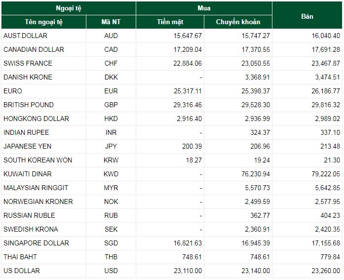 Vietcombank niêm yết ở mức: 23.140 đồng - 23.260 đồng (mua - bán).