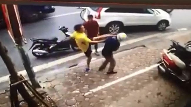 | Thanh niên mặc áo vàng đánh tới tấp người đàn ông đi xe máy. Trong khi đó, người bạn mặc áo đỏ đi cùng không đánh người đi xe máy mà chỉ đứng nhìn. Ảnh cắt từ video |
