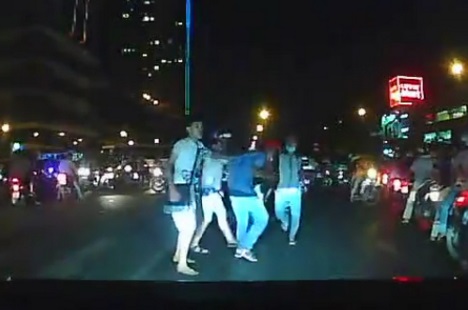 Video được quay lại bởi camera hành trình của một người đi đường. Nhóm thanh niên lao vào đấm đá nhau ngay giữa đường khiến giao thông náo loạn.