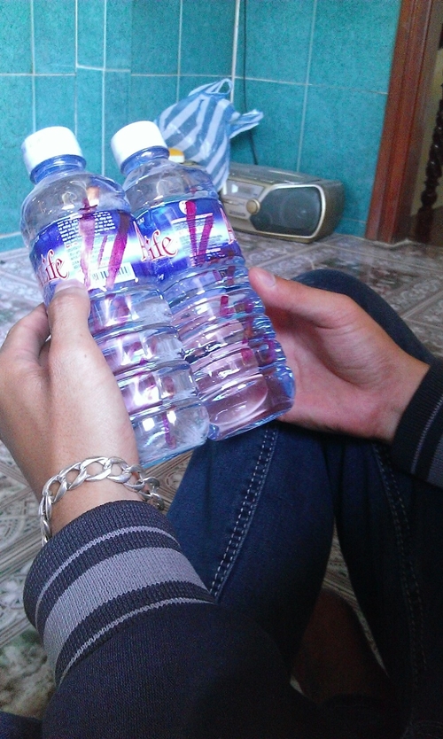 | Hai chai nước suối với những ký tự nguệch ngoạc, là “nước thánh” dành cho người đi thi cử. |