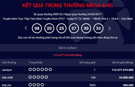 Thông tin trên Vnexpress và Tiền Phong đưa tin cho biết trong trong kỳ quay số mở thưởng 132 ngày 24/5 của sản phẩm Mega 6/45, Công ty Xổ số Điện toán (Vietlott) đã xác định một người trúng giải độc đắc (Jackpot) trị giá hơn 112 tỷ đồng.