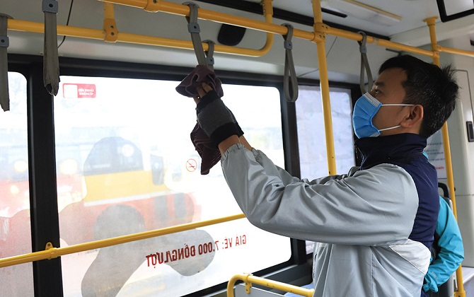 Nhân viên Tổng công ty Transerco lau chùi dây tay cầm, bề mặt bên trong cửa kính