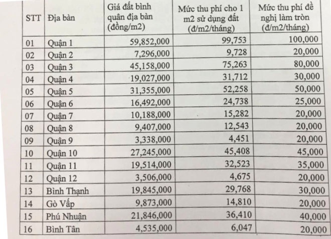 Trong khi đó, các quận 2, 7, 8, 9, 12, Gò Vấp, Bình Tân, Thủ Đức, Tân Phú, Bình Chánh, Hóc Môn, Nhà Bè, Củ Chi, Cần Giờ là 20.000 đồng/m2/tháng.