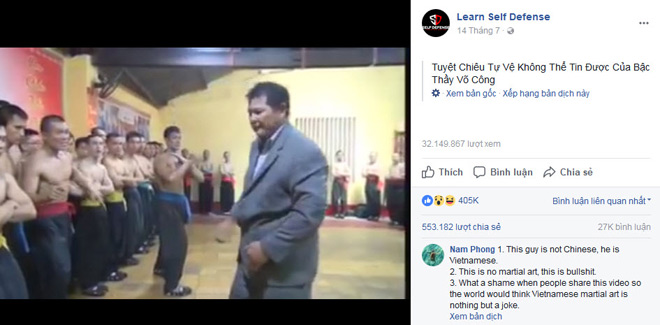 Trên trang fanpage chuyên về võ thuật "Learn Self Defense" cũng đăng tải lên video vị chưởng môn bí ẩn này biểu diễn võ thuật cách đây 3 tháng. Điều ngạc nhiên là tới ngày 3/10, clip này đã đạt tới 30 triệu lượt xem, con số người xem ấn tượng nhất trang fanpage này.