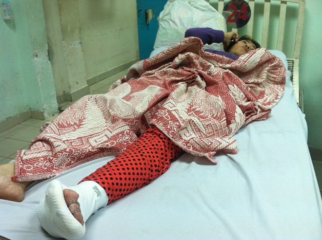 Chị Phương được các bác sĩ bó bột chân trái bị gãy sau khu tai nạn giao thông - Ảnh: Khánh Trung/ Zing |