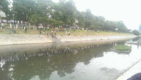 Trên bờ, một số người hô hoán người đàn ông kia lên bờ. Tuy nhiên, người đàn ông này vẫn cố thủ dưới dòng nước và bơi từ cầu 361 xuống phía đường Trần Duy Hưng.