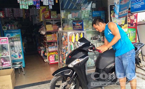 Khi vào cửa tiệm, anh ta đã chạm tay vào cổ của chiếc SH dựng trước cửa kiểm tra. Mua kẹo xong, người này lên xe máy chạy đi.
