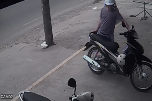 Sau một hồi quan sát không có ai, một người bước lại gần chiếc xe máy rồi dùng vật lạ để bẻ khóa.