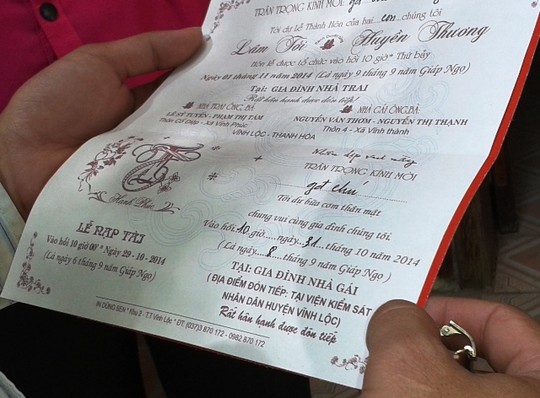Theo ghi nhận của phóng viên, ngoài sân của Viện Kiểm sát (VKS), 3 chiếc rạp đám cưới được dựng lên sát nhau. Trong giấy mời dự đám cưới con gái bà Thạnh ghi rõ “Tới dự bữa cơm thân mật, chung vui cùng gia đình chúng tôi vào hồi 10h, ngày 31/10/2014 tại gia đình nhà gái (Địa điểm đón tiếp: Tại Viện Kiểm sát nhân dân huyện Vĩnh Lộc)”.