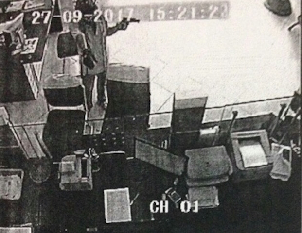 Thủ phạm chĩa súng gây ra vụ cướp ngân hàng. Ảnh chụp màn hình |