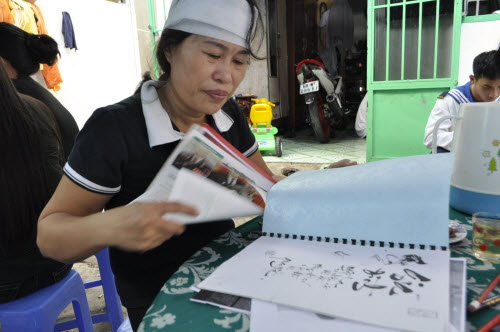 Chị Hà lật lại những trang giấy viết chữ thư pháp của thượng úy Bắc và kể về cuộc đời sống sống hết mình vì mọi người của anh.