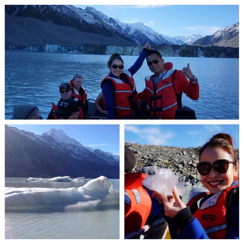 Jennifer Phạm hào hứng chia sẻ: "Lượn trực thăng qua đỉnh núi cao nhất New Zealand, Mount Cook và đáp trên mặt sông băng Tasman. Cảm giác thật tuyệt vời.... Một buổi trải nghiệm đầy thú vị cùng sông băng Tasman và lần đầu tiên được cầm một phiến băng trôi lạnh buốt trong tay".
