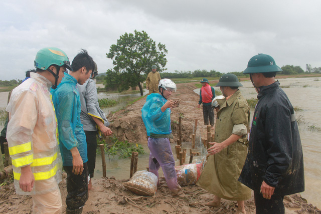 | Lực lượng chức năng cùng người dân tiến hành khắc phục sự cố vỡ đê. Ảnh: Dân Trí |