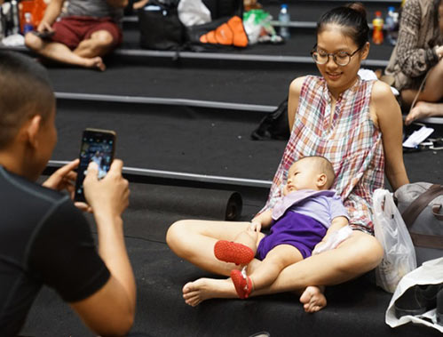 Vợ Chí Anh cùng con gái tới sàn tập cổ vũ chồng và Khánh Thi. Ảnh: Eva/Khám phá |