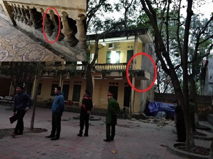 Tại hiện trường, ngoài khu lan can đã bị sập đổ, một số trụ cột còn sót lại đã có dấu hiệu nứt vỡ, nhiều trụ lộ cả những thanh sắt hoen gỉ khi vôi vữa đã bị mục, bở ra. Một số phần lan can của các lớp được nhà trường gia cố, hàn bằng các thanh sắt ở bên ngoài.