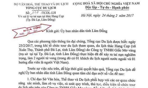 Để kịp thời giải quyết hậu quả, Tổng cục Du lịch đề nghị UBND tỉnh Lâm Đồng chỉ đạo Sở VH-TT-DL phối hợp cùng các cơ quan chức năng xác minh, làm rõ vụ việc, rà soát quy trình, thủ tục, điều kiện tổ chức tour du lịch nêu trên của Công ty TNHH Giấc mơ vàng; điều kiện tổ chức kinh doanh du lịch mạo hiểm của đơn vị quản lý, khai thác vận hành khu du lịch thác Hang Cọp, nơi xảy ra tai nạn, có báo cáo chính thức về tình hình vụ việc, gửi Tổng cục Du lịch trước ngày 26/2/2017 để tổng hợp, báo cáo Bộ trưởng Bộ Văn hóa, Thể thao và Du lịch.