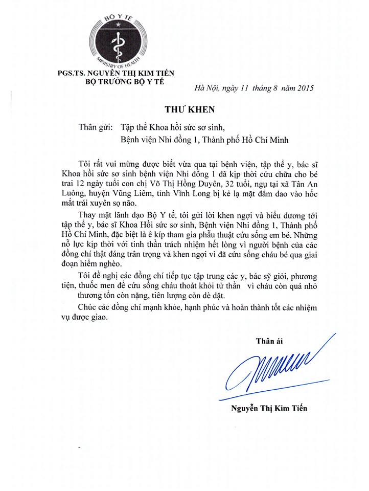 Ngày 11/8, Bộ trưởng Bộ Y tế Nguyễn Thị Kim Tiến đã gởi thư khen ngợi và biểu dương tập thể y, bác sĩ khoa Hồi sức Sơ sinh, BV Nhi đồng 1 (TP.HCM), đặc biệt là ê kíp phẫu thuật tham gia cứu sống em sé sơ sinh Dương Minh Phát, 11 ngày tuổi, con của chị Võ Thị Hồng Duyên (33 tuổi, Vũng Liêm, Vĩnh Long) vào ngày 8/8.