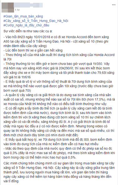 Về việc này, ông Đặng Quốc Việt, cửa hàng trưởng cửa hàng xăng dầu số 9, Trần Hưng Đạo cho biết, vào khoảng 8h23 sáng cùng ngày, vị khách này đã lái xe ô tô đến đổ xăng và nhân viên cây xăng đã làm đúng trình tự quy định. Sau đó, vị khách này lại thắc mắc là tại sao bình xăng của mình chỉ có dung tích 70 lít nhưng cửa hàng này đổ lên đến gần 80 lít. Thấy vậy, ông Việt đã đưa bình đo thể tích được kiểm định của nhà nước dung tích 5 lít ra để đo kiểm tra.