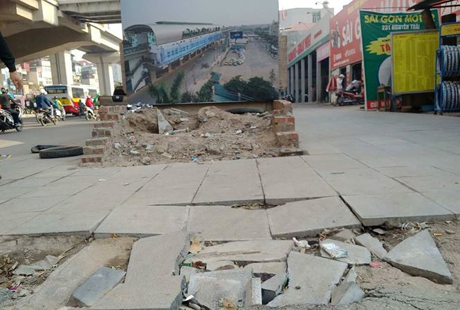 Vỉa hè đường Nguyễn Trãi vừa lát đá xong đã nát bươm. Ảnh: Tiền Phong |