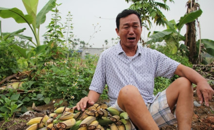 Ông Phạm Văn Quân cùng vườn chuối bị chặt phá. Ảnh: Lao Động |