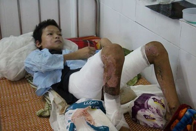 Theo bác sĩ Nguyễn Quang Trúc, Trưởng khoa Chấn thương, Bệnh viện Đa khoa Hà Tĩnh cho biết, cháu Trương Văn Thành (13 tuổi, ở thị trấn Thạch Hà, huyện Thạch Hà, Hà Tĩnh) nhập viện trong tình trạng bỏng nặng. Toàn bộ da có 2 đùi, một phần da bụng và tầng sinh môn bị cháy và bỏng nặng. Nhất là da ở hai bên đùi của cháu bị cháy gần như hoàn toàn.