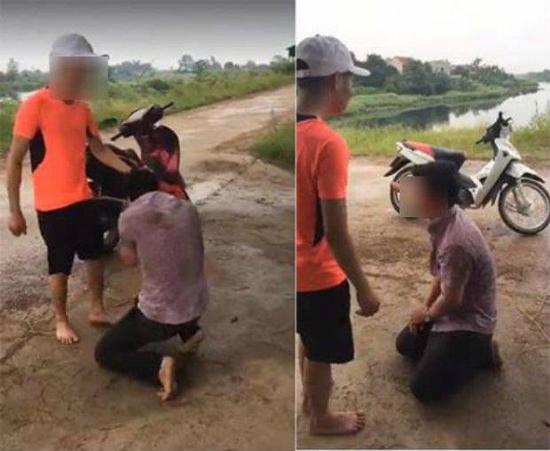 | Thanh niên bị đánh tới tấp, bắt quỳ gối xin lỗi. Ảnh cắt từ clip. |