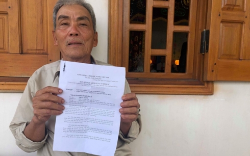 | Ông Trần Danh cùng lá đơn yêu cầu khởi tố để đòi lại công bằng cho con trai trước đó. Ảnh VOV |