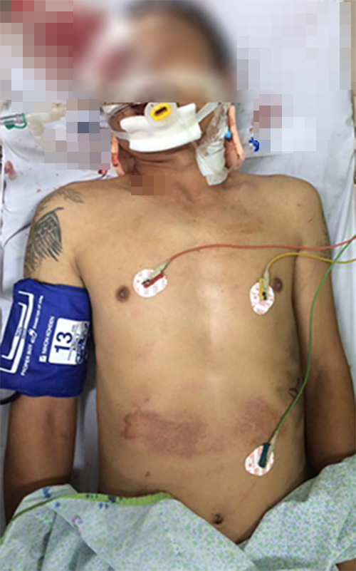 Hiện tại bệnh nhân vẫn hôn mê và phải thở bằng máy, đồng tử hai bên đều, bụng mềm, không chướng, lồng ngực, khung chậu vững. Chân tay không thấy có dấu hiệu gãy xương. Tuy nhiên, bệnh nhân bị chấn thương sọ não, hàm mặt và gãy xương hàm trên, cùng hàm dưới.