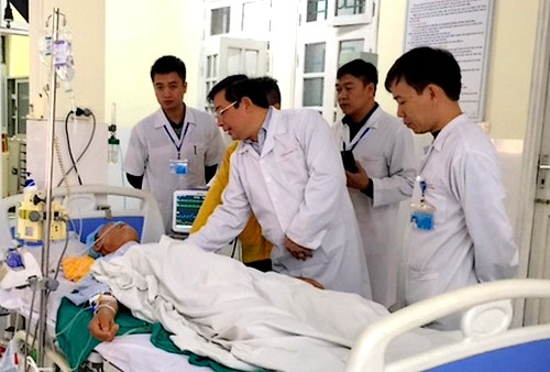 | Tiến sĩ Lương Ngọc Khuê, Cục trưởng Cục Quản lý Khám chữa bệnh thăm bệnh nhân Ma Văn Nhật. Ảnh: VnExpress. |