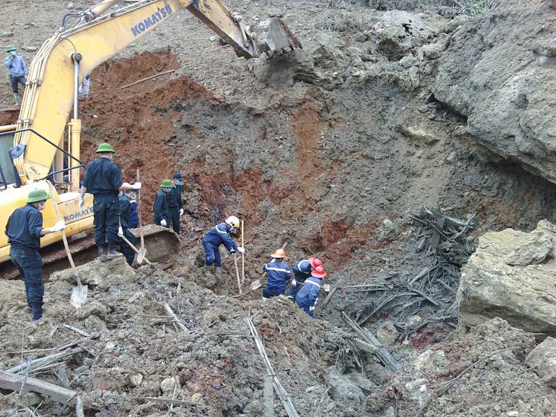 Nên đọcLực lượng cứu hộ đã dùng mìn phá những tảng đá (lượng mìn được tính toán đủ để phá đá nhưng không ảnh hưởng đến thi thể nạn nhân ở dưới). Sau khi phá đá, tiếp tục đào sâu xuống khoảng 2m đến nền đất cũ thì lực lượng chức năng tìm thấy một nửa thi thể phía trên là nữ giới, ngay sau đó tìm thấy 2 thi thể nam.