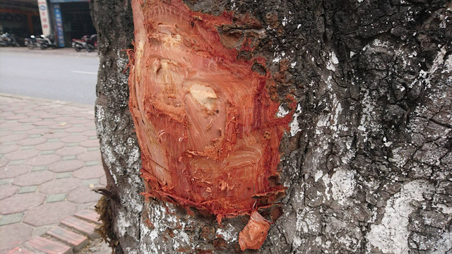 Cây xà cừ bị đẽo vỏ tại đường Láng. Ảnh: Dân trí |