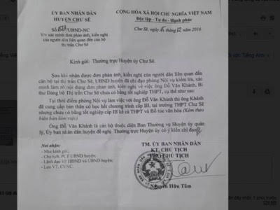 Trước đó, khi UBND huyện Chư Sê nhận được đơn phản ánh từ người dân về việc ông Nguyễn Văn Khánh chưa có bằng tốt nghiệp THPT. Đơn vị đã ra văn bản số 1563/UBND-NC do Phó Chủ tịch UBND huyện Chư Sê - ông Nguyễn Hữu Tâm ký để giao phòng Nội vụ huyện này xác minh làm rõ.