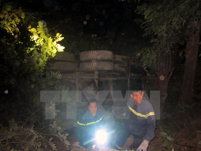 | Lực lượng chức năng có mặt tại hiện trường xử lý vụ tai nạn. Ảnh: TTXVN |