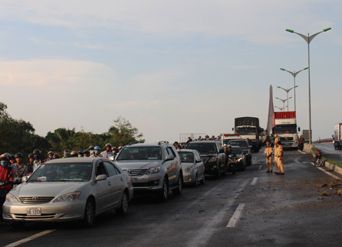 Hàng nghìn phương tiện xếp dài trên cầu Cần Thơ từ bờ Vĩnh Long sang Cần Thơ. Lực lượng CSGT phải vất vả để tiến hành phân luồng giao thông qua khu vực. Đồng thời, một xe cần cẩu được điều đến để di chuyển xe container gây tai nạn ra khỏi hiện trường.